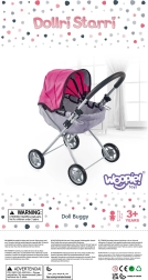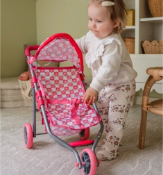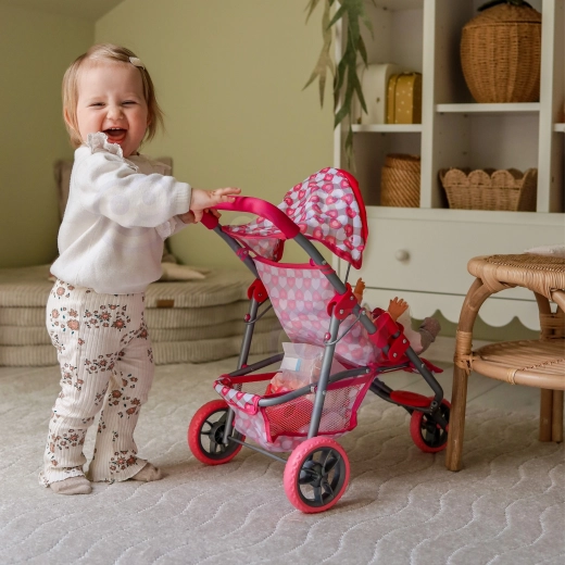 Zur praktischen Ausstattung gehören ein klappbares Sonnenverdeck, eine Fußstütze, Sicherheitsgurte und ein geräumiger Korb für Puppenzubehör. Leise Schaumstoffräder sind bodenschonend und bieten guten Grip. Nach dem Spielen lässt sich der Wagen leicht zusammenklappen und verstauen.