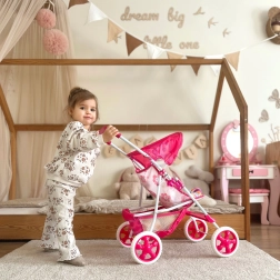 Der elegante Puppenwagen WOOPIE Royal mit Blumenprint ist eine großartige Wahl für Kinder, die Erwachsene nachahmen möchten. Der leichte, aber stabile Rahmen sorgt für komfortable und sichere Nutzung, während das klappbare Verdeck die Puppe „vor der Sonne“ schützt. Dank des weichen Griffs und der leisen, griffigen Schaumstoffräder lässt sich der Wagen auf Teppich und glattem Boden leicht manövrieren.