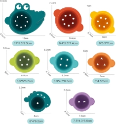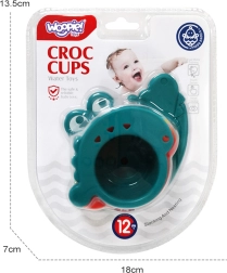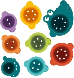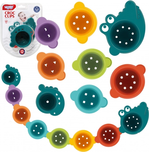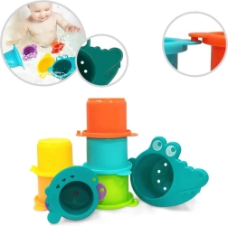 Die Becher lassen sich ineinander stapeln, zu einem hohen Turm bauen oder seitlich verbinden zu einem langen „Schwanz“. Einer der Becher hat das niedliche Krokodil-Design, das für zusätzlichen Badespaß sorgt. Die bunten Farben und Öffnungsformen unterstützen das Lernen von Farben und geometrischen Formen.
