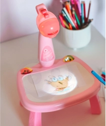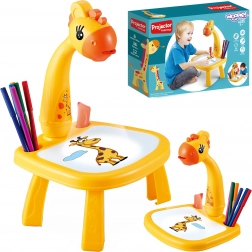 Der Projektions-Zeichentisch in Giraffenform projiziert bunte Motive direkt auf die Tischfläche oder auf eingelegtes Papier. Kinder wählen ein Motiv, schalten den Projektor ein und zeichnen die Konturen einfach nach – Schritt für Schritt lernen sie zu zeichnen. Die Oberfläche ist trocken abwischbar, sodass sich die Bilder mit dem beiliegenden Schwämmchen abwischen lassen und immer wieder neu gestaltet werden können.