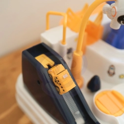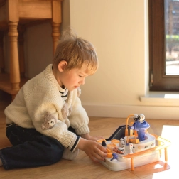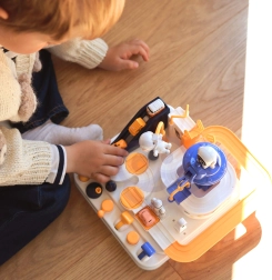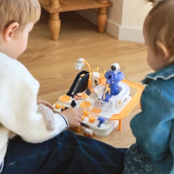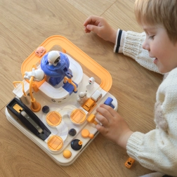 Die Raumstation wird zum actionreichen Spielfeld: Kinder planen die Strecke, überwinden Hindernisse und lenken mittels Knöpfen und Reglern Autos über Rampen, Aufzüge und Drehscheiben. Die magnetische Rakete transportiert Fahrzeuge „durch die Luft“ zur Hubbrücke, die je nach Bedarf gesenkt und angehoben werden kann.