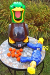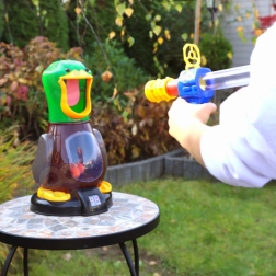 Dank der luftbetriebenen Pistole sind in der Pistole keine Batterien nötig – einfach das hintere Teil zusammendrücken und auslösen. Die weichen Schaumstoffbälle sind sanft und sicher für drinnen und draußen, außerdem dient die Ente als Aufbewahrungsbehälter für die Bälle.