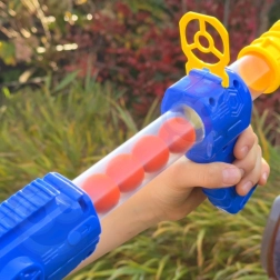 Die leichte Pistole mit manuellem Luftantrieb und die weichen Bälle sorgen für sicheren Spielspaß zu Hause und draußen, ganz ohne Batterien in der Pistole.