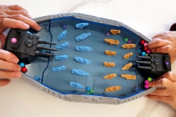 Bunte Schiffe und U-Boote auf dem Spielbrett schaffen eine realistische Schlacht, die Kinder vom ersten Schuss an ins Spiel zieht.