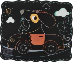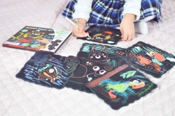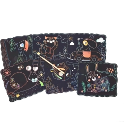 Im Set enthalten sind 6 Kratzkarten mit Tieren – Katze, Hund, Schnecke, Kaninchen, Fisch und Papagei – sowie ein Holzstylus. Dank der praktischen Hülle mit Verschluss lässt sich das Set leicht ins Auto, ins Restaurant oder in den Urlaub mitnehmen. Die Aktivität fördert Feinmotorik, Geduld und Kreativität.