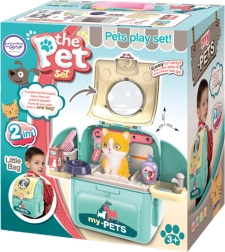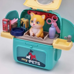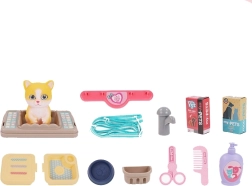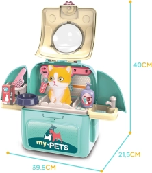 Entdecke das kompakte 2-in-1-Set – einen niedlichen Rucksack/Transporter mit Sichtfenster und einen vollständigen mini Pflegesalon für Haustiere im Inneren. Kinder können das Kätzchen im Becken mit Wasserhahn baden, kämmen, schneiden und danach aus den Näpfen füttern. Verriegelbare Türen und ein abnehmbarer Gurt sorgen für bequemes und sicheres Tragen.