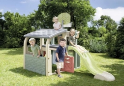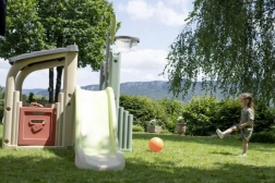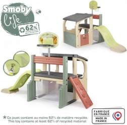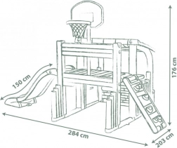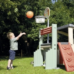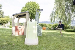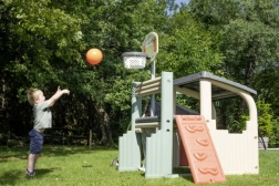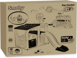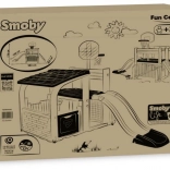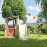 Das multifunktionale SMOBY Spielcenter verbindet Sport, kreatives Spiel und Entspannung. Kinder können auf den Basketballkorb werfen, die Treffsicherheit am Fußballtor trainieren, die Koordination an der Kletterwand stärken und sich auf der 150-cm-Rutsche austoben. Ein überdachtes Häuschen mit Türchen sorgt für ruhige Momente und fantasievolles Spiel.