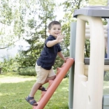 Kletterelemente und eine 150-cm-Rutsche fördern Gleichgewicht, Kraft und Motorik. Kinder klettern mühelos hinauf und rutschen fröhlich wieder hinunter.