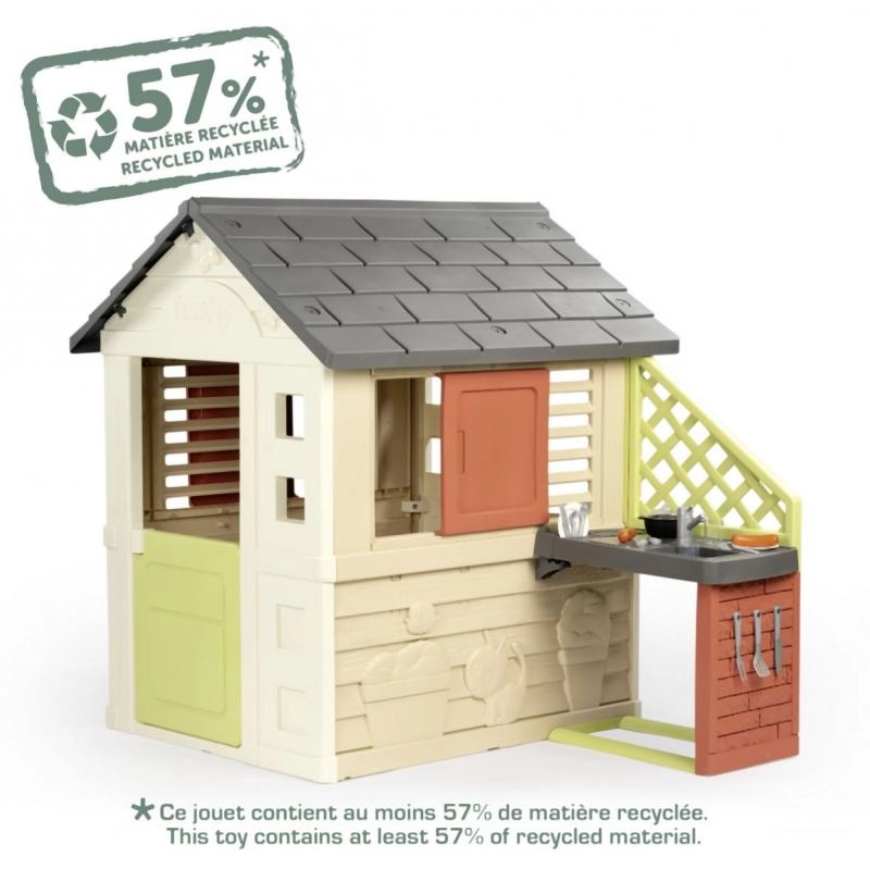Das Gartenhaus gehört zur umweltfreundlichen Serie Smoby Life, bei der 57 % des Materials aus recycelten Quellen stammen. Durchdachte Details wie geprägte Blumen- und Tiermotive fördern Wahrnehmung und Kreativität. Das Spiel im Haus unterstützt zudem Zusammenarbeit, Kommunikation und gesunde Bewegung an der frischen Luft.