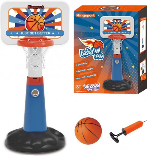 Das Set enthält einen Basketballkorb, einen Ball und eine Pumpe – alles, was ein Kind zum Spielen braucht.