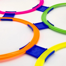 Enthält 10 verbindbare Reifen, die frei für verschiedene Konfigurationen des Spiels Klase zusammengebaut werden können.