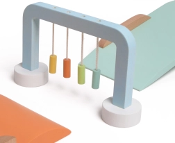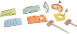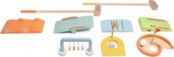 Zum Set gehören 2 Golfschläger, 2 Bälle, 2 Löcher mit Fähnchen und 5 originelle Hindernisse, mit denen Kinder eigene Strecken gestalten. Das Spiel fördert Zusammenarbeit, Geduld und Bewegungsaktivität.