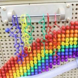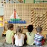 Kinder legen Bilder mit Steckstiften, bauen Muster und arbeiten gemeinsam an Projekten. Die Aktivitäten fördern Vorstellungskraft, Hand-Auge-Koordination und Teamarbeit.