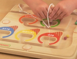 Deutlich markierte Farbzonen und Kugeln in fünf Farben führen Kinder ganz natürlich zum Erkennen und Sortieren von Farben.
