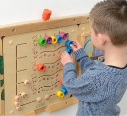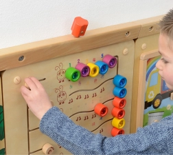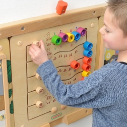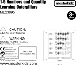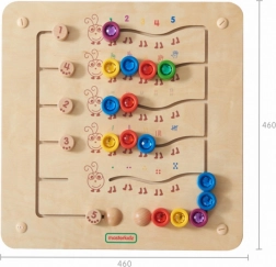 Eine Lernwandtafel mit fünf bunten Raupen für spielerisches Lernen von Zahlen und Mengen. Enthält 15 Diamant-Zählsteine in fünf Farben, die auf Schiebeschienen angebracht sind. Die Tafel ermöglicht Kindern eine interaktive Beteiligung und zeigt 5 Darstellungsarten der Zahlen von 1 bis 5: Ziffern, Finger, Striche, Blöcke und Punkte. Auf der linken Seite befinden sich Schieber, mit denen sich unterschiedliche Schwierigkeitsgrade einstellen lassen.