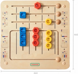 Diese Lern-Tafel wurde entwickelt, um die Formerkennung und die Feinmotorik zu fördern. Sie ist in zwei Teile unterteilt: Der obere Teil enthält einen Aufgabenstreifen, auf dem Kinder drei Formen (rotes Sechseck, blaues Quadrat und gelber Kreis) an die richtigen Stellen setzen müssen. Der untere Teil der Tafel enthält drei Spalten mit 9 Formen, die Kinder entsprechend Farbe und Form korrekt zuordnen sollen. Die Elemente sind so angebracht, dass sie sich leicht verschieben lassen, aber nicht verloren gehen können. Die Tafel kann auf dem Tisch verwendet oder an der Wand befestigt werden.