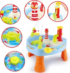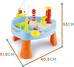 Der Wasser-Spieltisch mit Angeln der Marke Woopie bietet interaktiven Spaß mit 24 Zubehörteilen, wie Fischen, Krabben, Angelruten und mehr. Mit Wasser befüllt sorgt er für großen Spielspaß drinnen wie draußen. Für zusätzliche Abwechslung sorgen Licht- und Soundeffekte, die durch Drücken des Leuchtturms aktiviert werden.