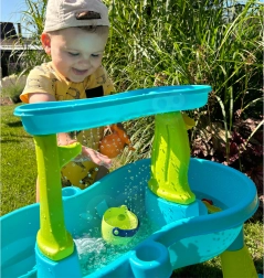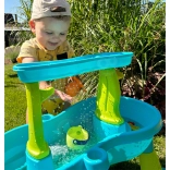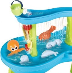 Kinder gießen Wasser in die obere Tischhälfte und beobachten den Fluss durch Wassermühlen und Löcher für einen unterhaltsamen Wassereffekt.