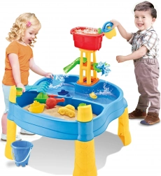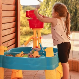 Die umfangreiche Ausstattung mit 14 Zubehörteilen (Förmchen, Gießkanne, Mühle, Schaufel, Harke, Auto und 2 Boote) fördert Fantasie, Hand-Auge-Koordination und das gemeinsame Spiel mehrerer Kinder. Dank der stabilen Kunststoffkonstruktion ist der Tisch für den Außen- und Innenbereich geeignet und leicht zu reinigen.