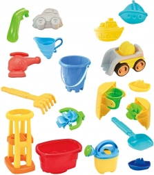 Förmchen, Gießkanne, Schaufel, Harke, Auto und zwei Boote fördern kreatives Bauen, Umfüllen und das gemeinsame Spiel mehrerer Kinder.