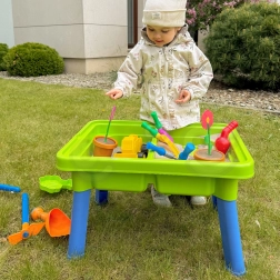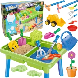Die umfangreiche Ausstattung mit 13 Zubehörteilen (Gießkanne, Schaufeln, Harke, Förmchen, kleines Kipper-Auto, Blumentopf mit Blüte und mehr) regt die Vorstellungskraft an, fördert die Feinmotorik und eignet sich für selbstständiges wie gemeinsames Spiel. Ideal für Garten, Terrasse, Strand und Kinderzimmer.
