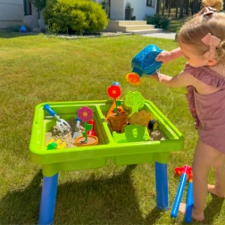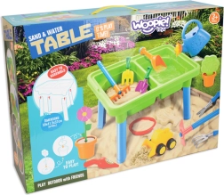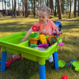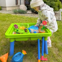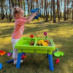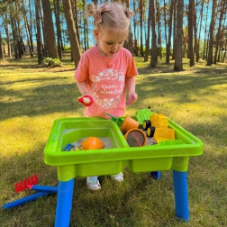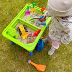 Entdecken Sie den vielseitigen 2-in-1-Spieltisch WOOPIE, der Wasserspaß und Sandkreativität in einem kompakten Set vereint. Zwei separate Fächer ermöglichen es, eines mit Wasser und das andere mit Sand zu füllen, sodass Kinder gleichzeitig schöpfen, umfüllen, sieben und formen können.