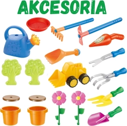 Gießkanne, Schaufeln, Harke, Förmchen, Blumentopf mit Blüte und ein kleiner Kipper erweitern die Spielmöglichkeiten und fördern die Fantasie der Kinder.