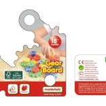 Die hölzerne Tafel hat Löcher, in die Stifte eingesetzt werden können, die die Zahnräder halten. Diese Zahnräder können in Reihen angeordnet werden, damit sie sich gegenseitig in Bewegung versetzen. Der Spaß ist sehr kreativ und wird die Kinder stundenlang fesseln.