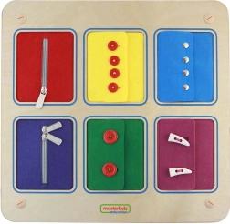 Die Tafel ist ideal für Kindergärten, Spielecken und Zuhause. Dank der robusten Holzkonstruktion, der leuchtenden Farben und Texturen regt sie zum Entdecken an, trainiert Geduld und stärkt die Selbstversorgung.