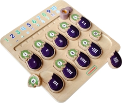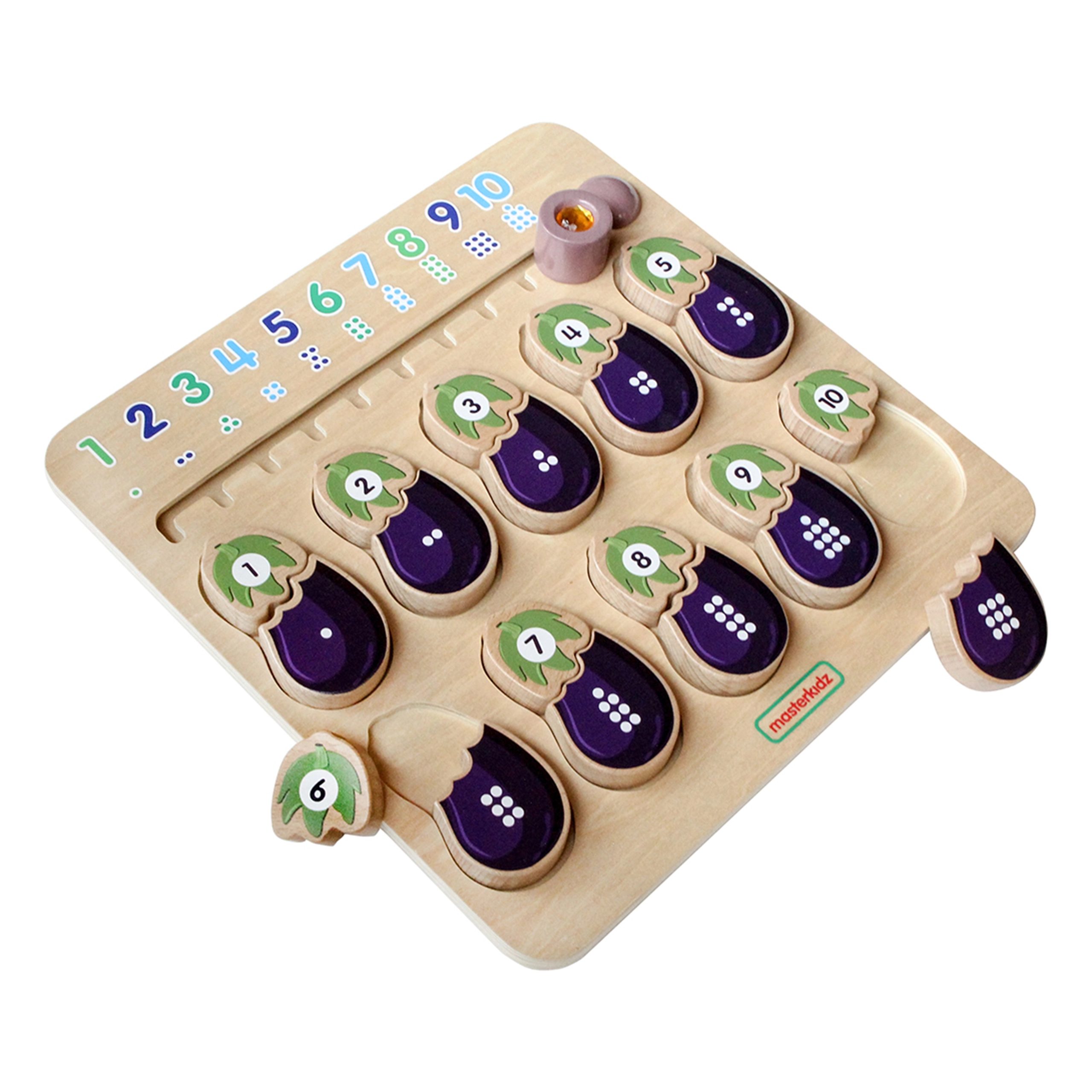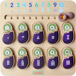 Die hölzerne Lerntafel der Marke MASTERKIDZ wurde entwickelt, um die Sinne von Kindern zu fördern. Diese Tafel hilft Kindern, Zahlen und Farben kennenzulernen. Die Kinder müssen die richtigen Teile der Aubergine zusammensetzen – ein Teil stellt die Zahl dar, der andere die entsprechende Anzahl von Punkten. Oben befindet sich ein Schieber mit Zahlen und Punkten in der richtigen Reihenfolge.