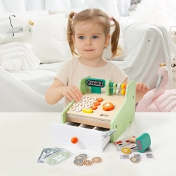 Diese Holzkasse ist das ideale Spielzeug für kleine Verkäuferinnen, Verkäufer und Kundschaft. Sie bietet realistische Elemente wie Display, Tasten, Zähler, eine ausziehbare Schublade und einen Scanner, mit denen Kinder die Grundlagen des Rechnens, den Wert von Geld und Alltagssituationen spielerisch kennenlernen.