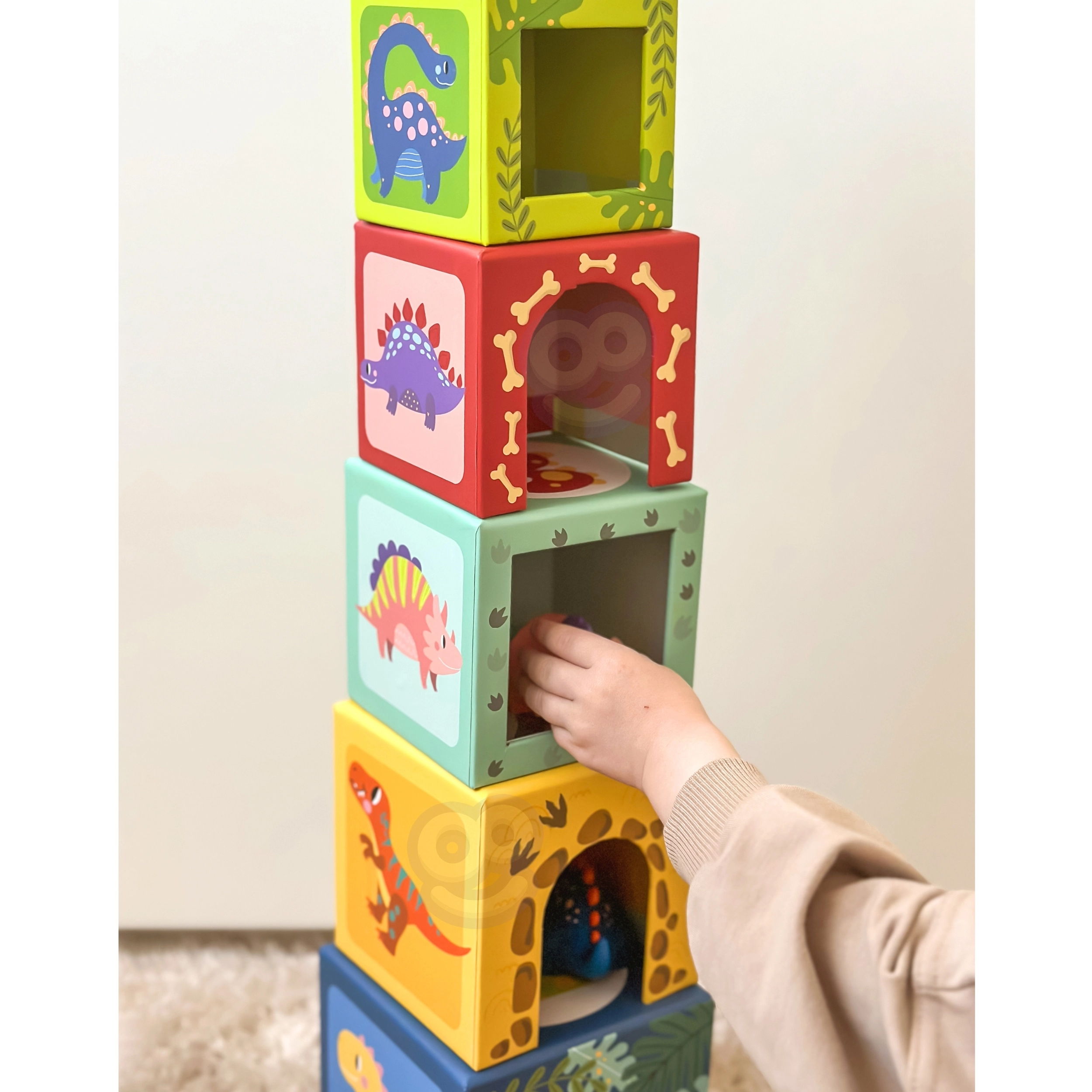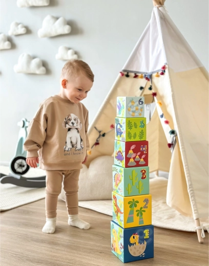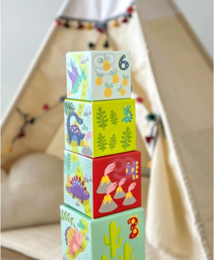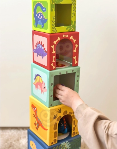 Die Würfel können zu einem hohen Turm gestapelt oder ineinander gesteckt werden. Kinder entdecken Prinzipien von Gleichgewicht, Reihenfolge und Größe und trainieren die Feinmotorik.