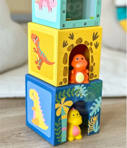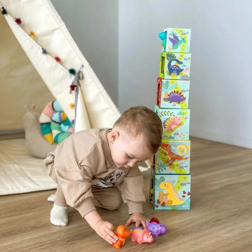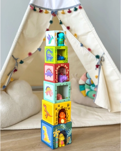 Das Set von TOOKY TOY kombiniert Stapel- und Steckwürfel mit niedlichen Dinosauriern. Die Aufgabe des Kindes ist es, anhand von Farbe und Illustration die richtige Figur dem passenden Würfel zuzuordnen und in das „Häuschen“ zu stecken. Dank der leichten Würfel und weichen Figuren ist die Handhabung auch für die Kleinsten einfach und sicher.
