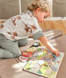 Dieses hölzerne Montessori-Einlegepuzzle bringt Kindern spielerisches Lernen. Das Set besteht aus einer robusten Platte mit Aussparungen und 7 Fahrzeug-Teilen (z. B. Auto, Taxi, Polizei, Krankenwagen, Feuerwehr, Flugzeug, Schiff), die Kinder nach Form und Bild zuordnen. Dank klarer Farben und übersichtlicher Konturen verstehen Kinder das Zuordnungsprinzip schnell und erleben mit jedem richtig eingesetzten Teil ein Erfolgserlebnis.