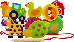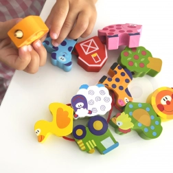 Dieses pädagogische Fädelspielzeug unterstützt Geduld, Konzentration und das Erfinden eigener Geschichten rund um das Leben auf dem Bauernhof. Die Teile sind robust, liegen angenehm in der Hand und sind ideal für kleine Kinderhände.