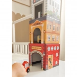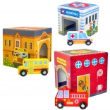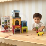 Fünf nummerierte Würfel mit Öffnungen ermöglichen das Bauen von Türmen, das Einsetzen der Fahrzeuge und ein spielerisches Entdecken der Stadt – ideal zur Förderung der Fantasie.