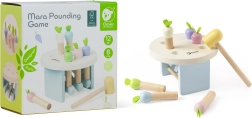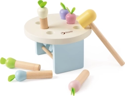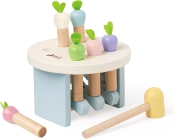 Zarte Pastellfarben ziehen die Aufmerksamkeit auf sich und steigern das Interesse des Kindes am Spielzeug. Das Spiel besteht darin, die Geschicklichkeit zu trainieren, indem die Karotten präzise hineingehämmert werden, die aus der Öffnung herausspringen.