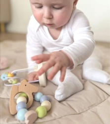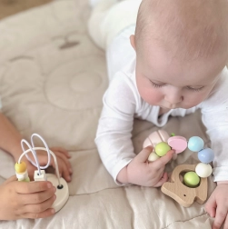 Das farbenfrohe Häschen, gefüllt mit Perlen, zieht die Aufmerksamkeit der Kinder auf sich und fördert ihr Hörvermögen. Ideal, um Greiffähigkeiten zu trainieren.