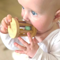 • Grzechotka Roller – Holzspielzeug mit bunten Kügelchen im Inneren zur Förderung motorischer Fähigkeiten.