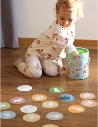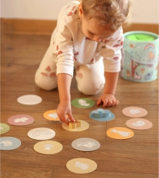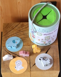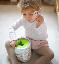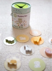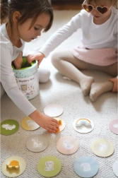 Bei dem Spiel Geheimnisvolle Kiste wählen Kinder eine der 15 Karten und erraten durch Berührung, welche Figur sich in der Kiste versteckt – dabei lernen sie, ihre Form zu erkennen. Das Spiel entwickelt den Tastsinn, die Feinmotorik und die Konzentration. Das Set bietet verschiedene kreative Spielmöglichkeiten, wie Paarbildung, Farbenlernen, Tiernamen und Turmbau.