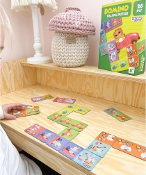 Das Produkt enthält 28 Domino-Karten mit Tierillustrationen, die richtig gepaart werden müssen.
