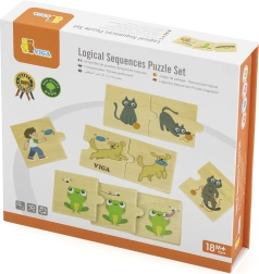 Das unterhaltsame und lehrreiche Holzpuzzle‑Set der Marke VIGA bringt Kindern bei, die Tätigkeiten von Tieren in die richtige Reihenfolge zu bringen. Es enthält 24 Holzteile, die 8 logische Sequenzen bilden (z. B. Apportieren des Hundes oder eine Giraffe, die Blätter vom Baum reißt). Fördert logisches Denken, Wortschatz, Konzentration, Feinmotorik sowie visuelle Koordination und ist bereits ab 18 Monaten geeignet.