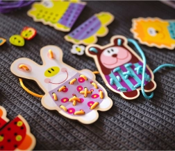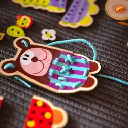 Das Auffädeln und die Handhabung der Elemente hilft bei der Entwicklung der feinen Muskeln der Hände und Finger, was wichtig für die Vorbereitung auf das Schreiben ist.