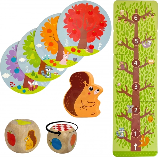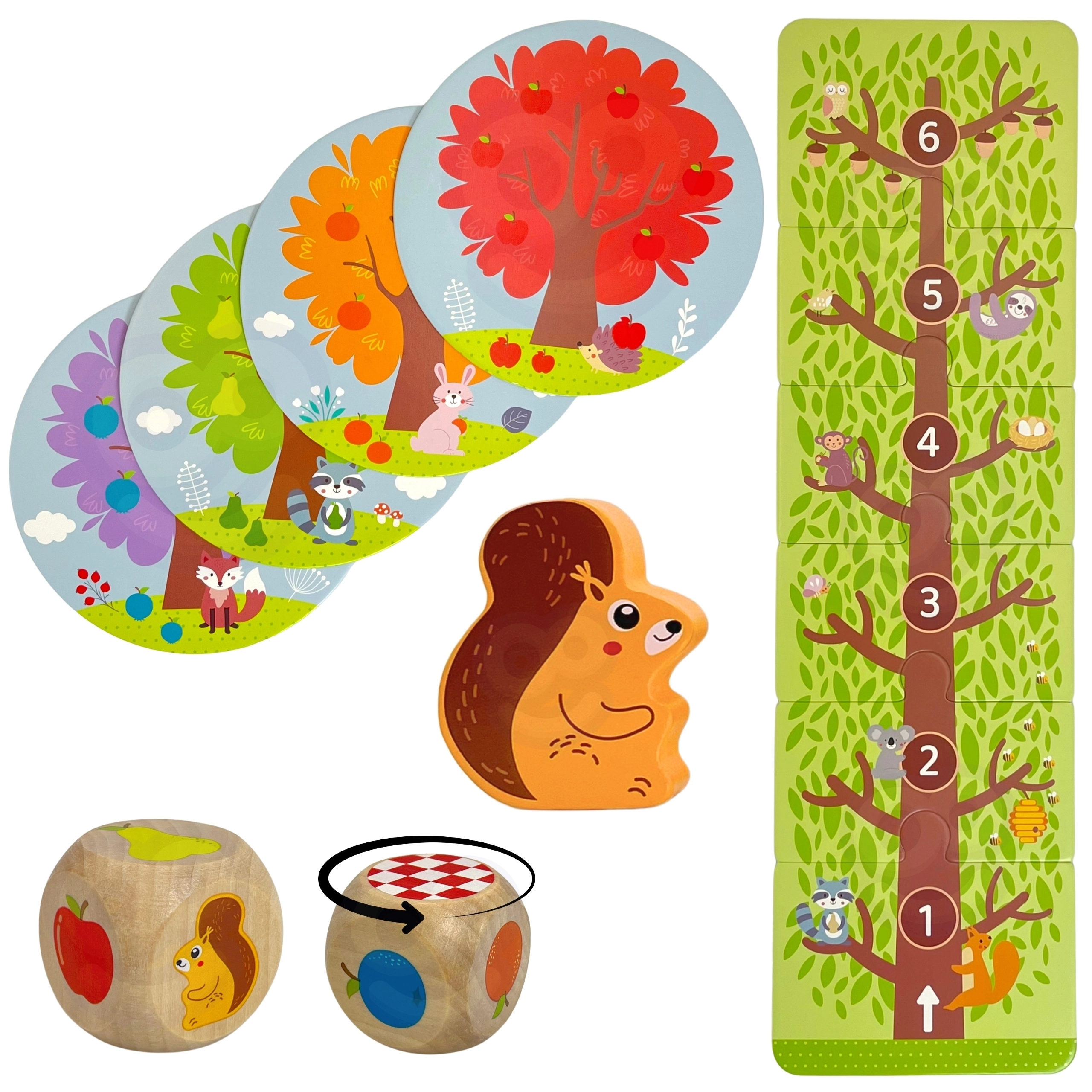 - Spielplan in Baumform, Eichhörnchen-Figur, 12 bunte Früchte, 4 Holzbäume, Korb, Würfel mit Obst- und Eichhörnchen-Bildern