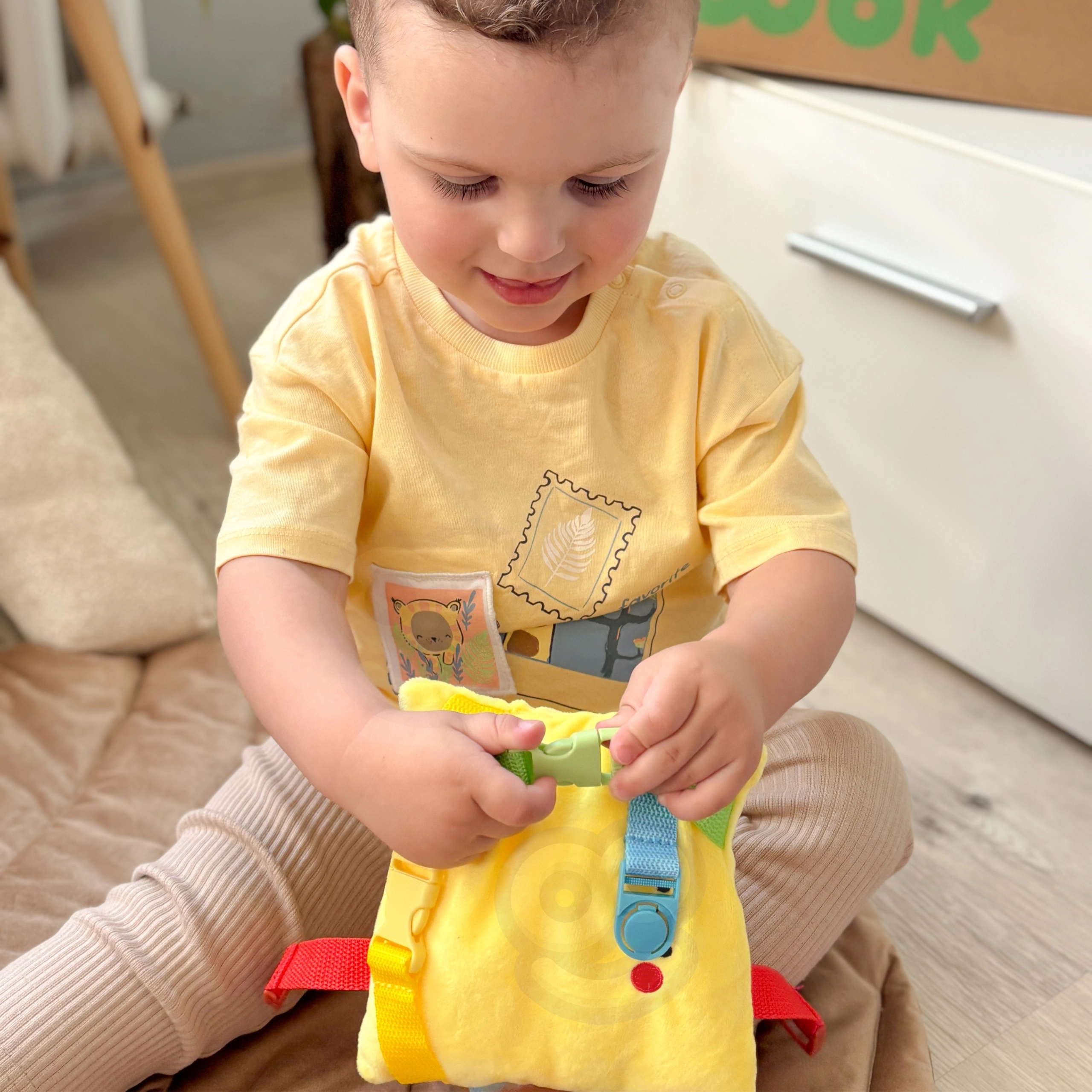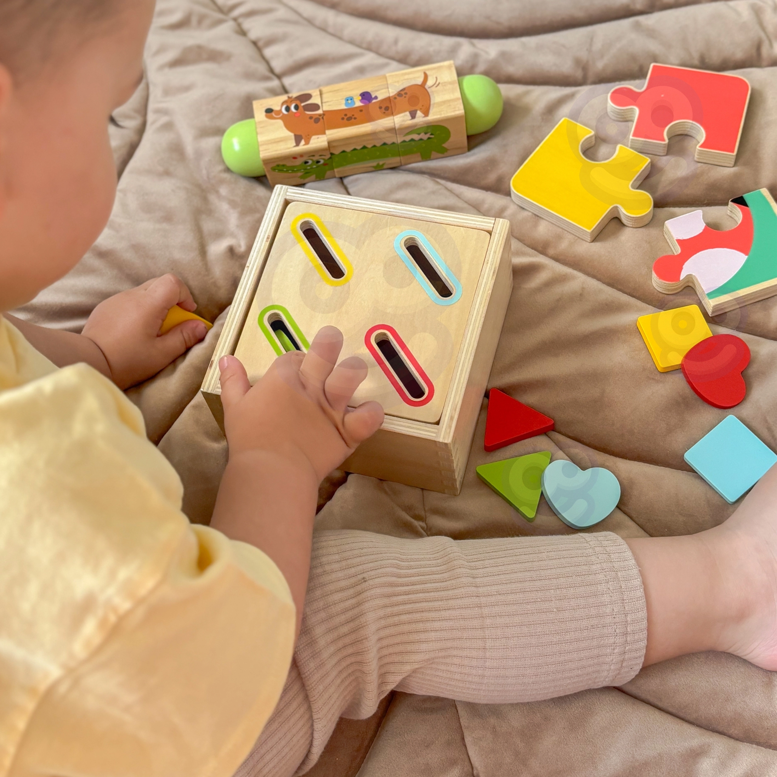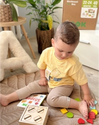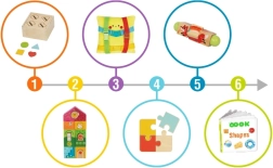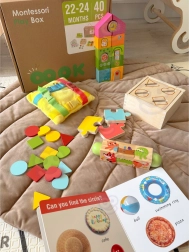 Sechs Lernaktivitäten in einer Box entwickeln Feinmotorik, Hand-Auge-Koordination, logisches Denken sowie Form- und Farberkennung – mit Fokus auf die Selbstständigkeit des Kindes.