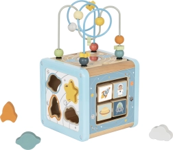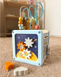 Der hölzerne Aktivitätswürfel mit Weltraum-Motiv von Tooky Toy bietet Kindern ab 18 Monaten stundenlangen Spiel- und Lernspaß. Er enthält einen Perlenlabyrinth, Formensortierer, drehbare Bildblöcke, bunte Zahnräder und Schiebeelemente, die Feinmotorik, Koordination und logisches Denken fördern. Dank Pastellfarben und durchdachtem Design ist der Würfel schön anzusehen und leicht zu verstauen – der obere Teil mit dem Labyrinth lässt sich nach innen klappen.