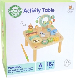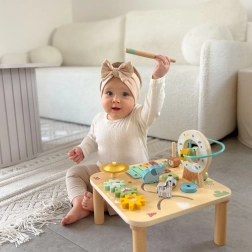 Entdecken Sie einen hochwertigen hölzernen Activity-Tisch, der Kinder auf natürliche Weise zum Entdecken anregt. Dank verschiedener Spielzonen – vom musikalischen Xylophon über Zahnräder bis zum Kugel-Labyrinth – trainieren Kinder ihre Koordination, Bewegungsgenauigkeit sowie das Verständnis von Ursache und Wirkung. Die robuste Holzkonstruktion und die zarten Pastellfarben passen perfekt ins Kinderzimmer.
