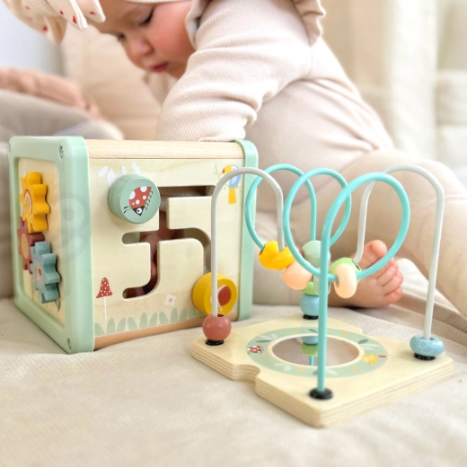 Auf der Oberseite befinden sich ein Motorik-Labyrinth mit Perlen und ein sicherer Spiegel, an den Seiten ein Formensortierer, drehbare Tierblöcke, Zahnräder und Schiebebahnen. Jedes Panel stellt eine andere Herausforderung dar, sodass das Kind Geduld, Kreativität und Problemlösefähigkeiten übt.
