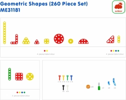 Dieses umfassende Set enthält Quadrate, Dreiecke, Kreise, Halbkreise und flache Streifen in mehreren Farben, die dank der Öffnungen mit Schrauben leicht an Masterkidz Panels, Tischen oder Wagen befestigt werden können. Kinder können Muster, Blumen und komplexere Konstruktionen erstellen und dabei Planung, Auswahl der Elemente und das Ausarbeiten von Details trainieren.