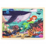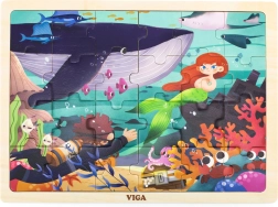 Das Kinderpuzzle VIGA – Geheimnis des Meeres zeigt eine farbenfrohe Unterwasserillustration mit Meerjungfrau, Taucher, Fischen, Korallenriff und versunkenem Schiff. Dank des Holzrahmens bleiben die Teile beim Puzzeln an Ort und Stelle, und das Bild auf der Grundplatte dient als klare Vorlage.